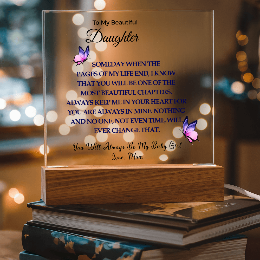 Your plaque will be crafted from premium acrylic with a professionally printed design for a polished look. It comes with a stylish wooden LED base, and you can choose between a USB plug-in option OR a cordless battery-operated option (requires 2 AAA batteries, not included). Both LED bases feature 7 vibrant colors, allowing the user to customize the lighting with various color changes and dynamic cycles.